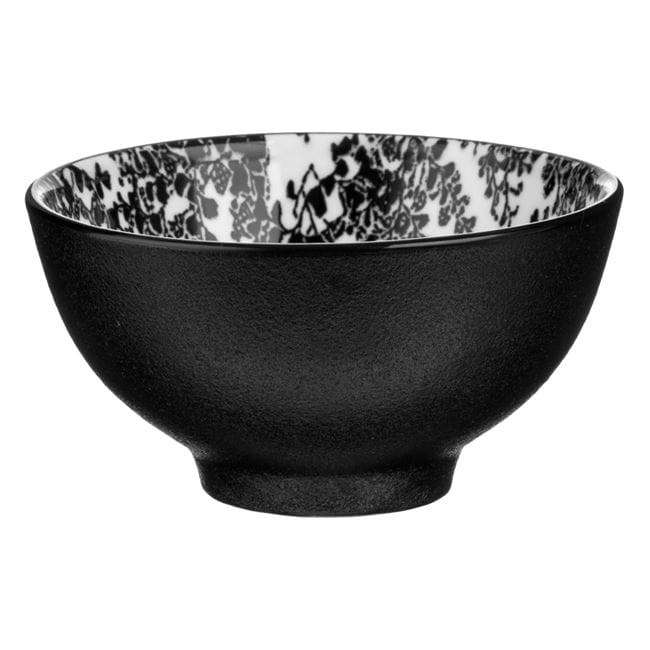 Bol din portelan, cu exterior negru mat si model floral pe interior.