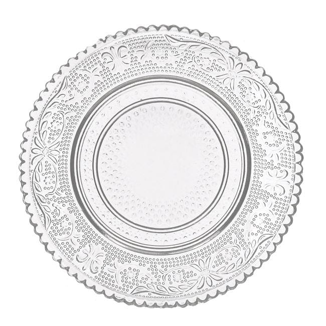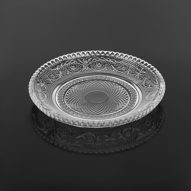 Farfurie pentru desert, din sticla transparenta cu model sculptat.