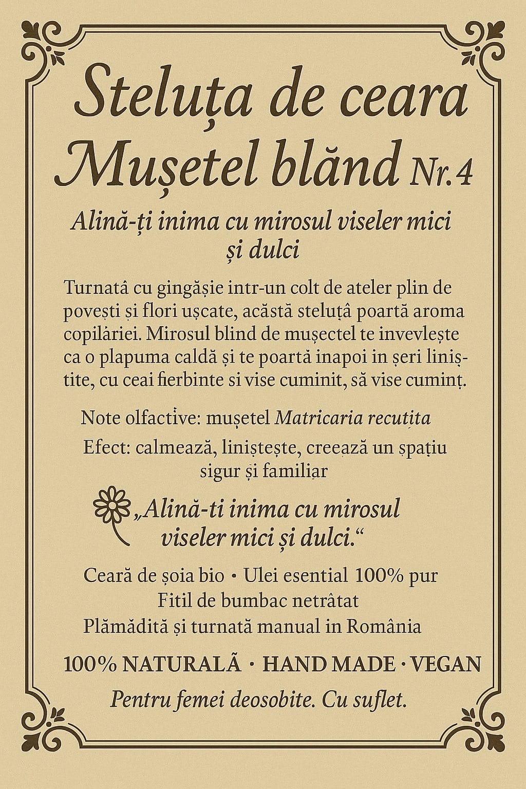 Lumanare Parfumata BIO Aromaterapie Steluța de ceară, Handmade, Musetel bland, 200g