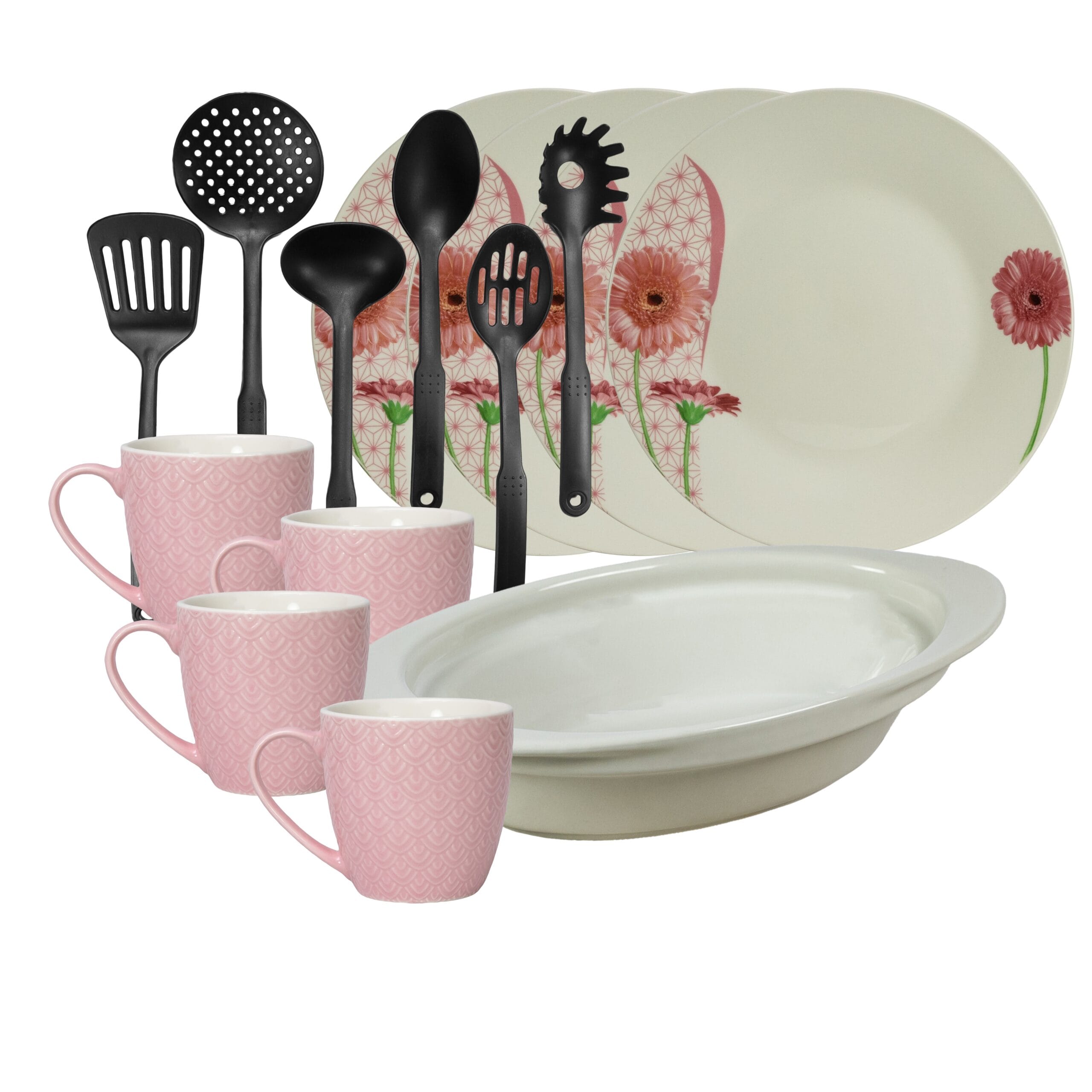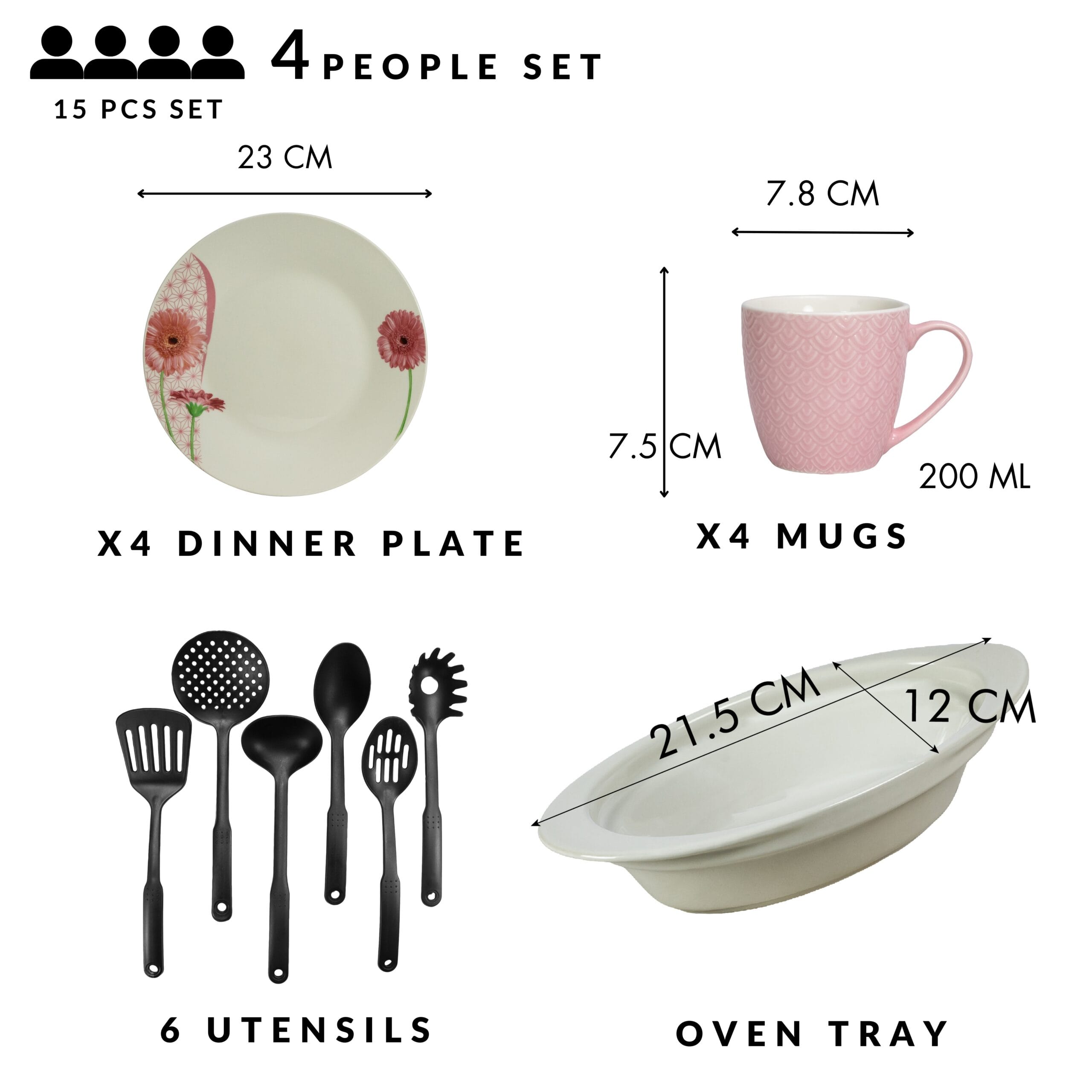 Serviciu de masa, 4 persoane, 15 piese, cana roz 200 ml, farfurie intinsa, tava termorezistenta, ustensile bucatarie, Portelan decorat cu Margareta
