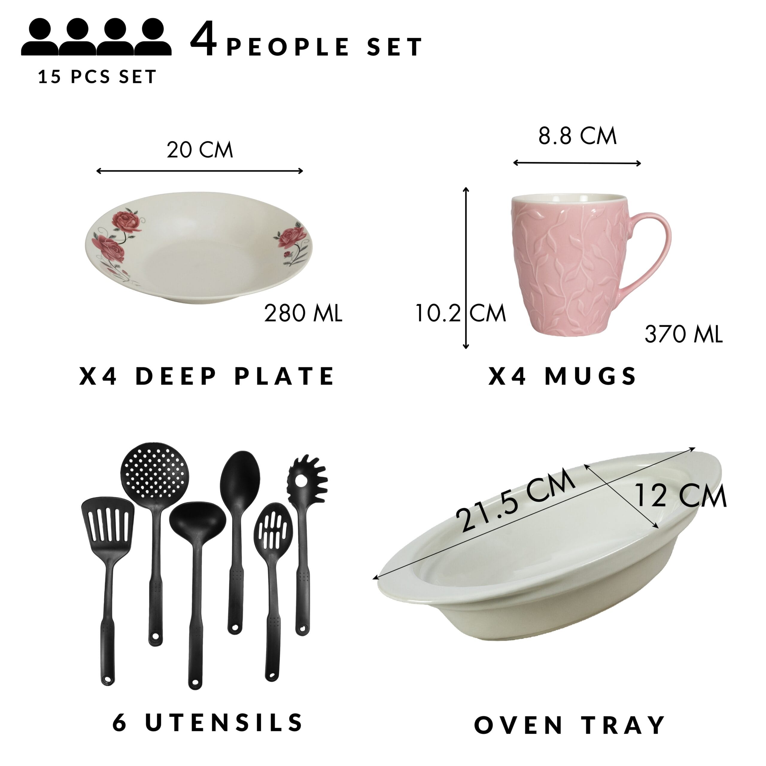 Serviciu de masa, 4 persoane, 15 piese, cana roz 370 ml, farfurie adanca, tava termorezistenta, ustensile bucatarie, Portelan decorat cu Trandafiri roz