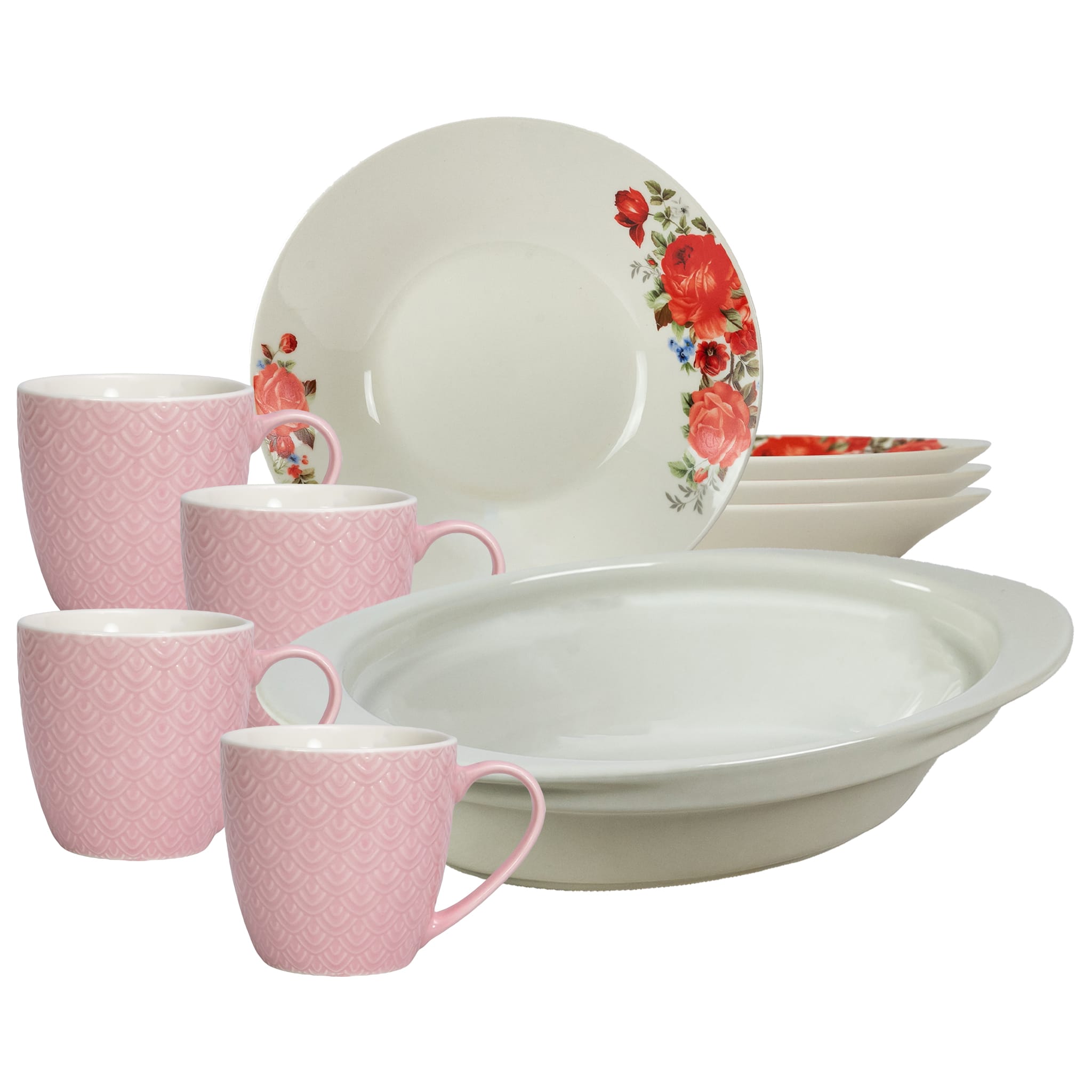 Set masa 4 pers., 9 piese, cana roz 200 ml, farfurie adanca, tava termorezistenta, Portelan Trandafiri rosii