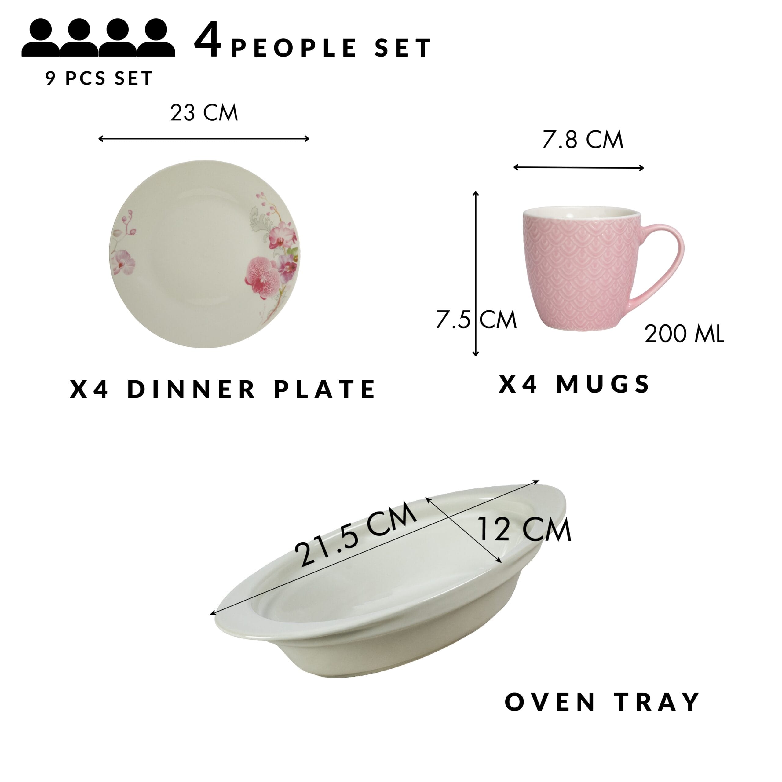 Set masa 4 pers., 9 piese, cana roz 200 ml, farfurie, tava termo, Portelan Orhidee