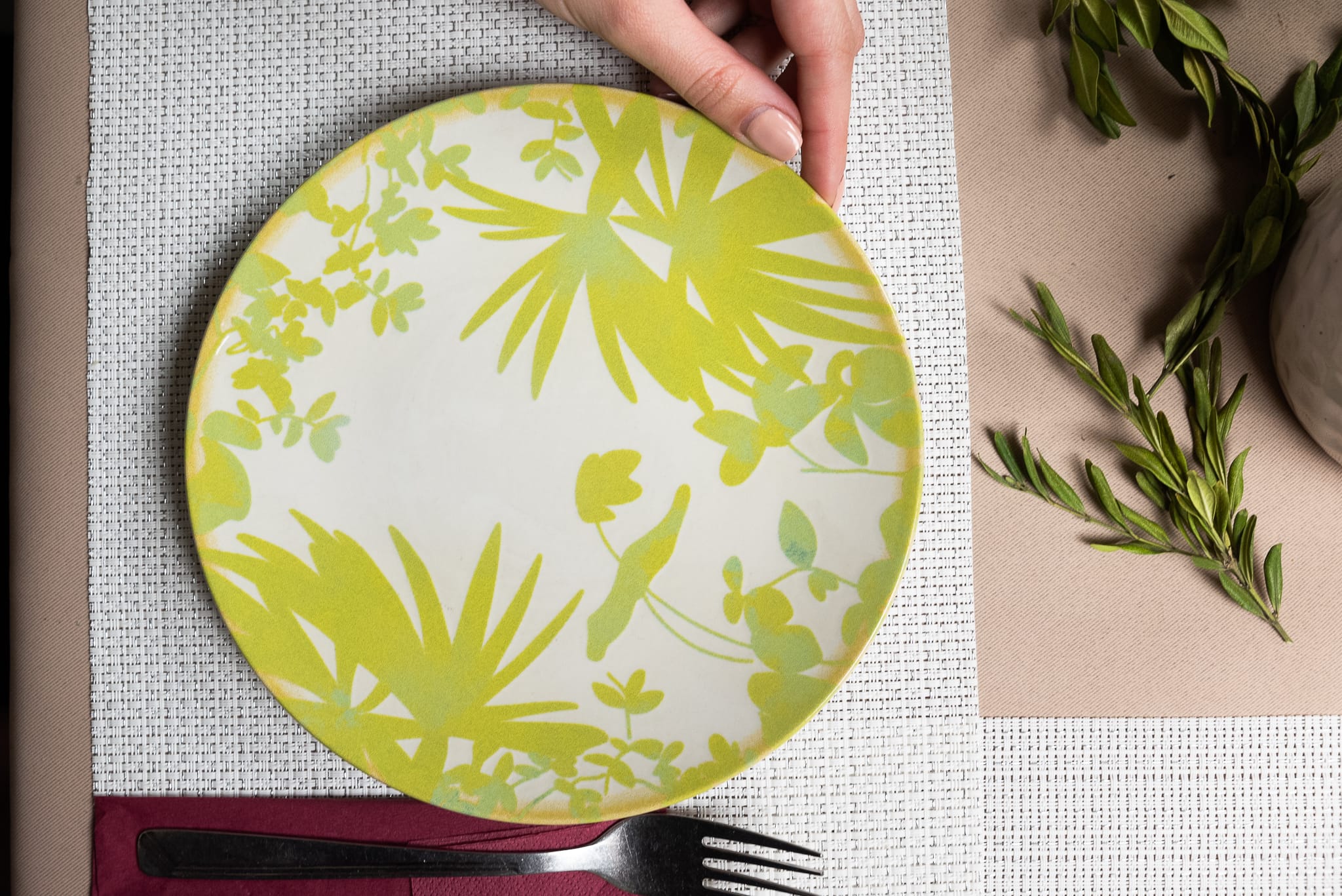 Set 4 farfurii desert, 20 cm, Hawaii, Crem deschis cu frunze verzi-galbui