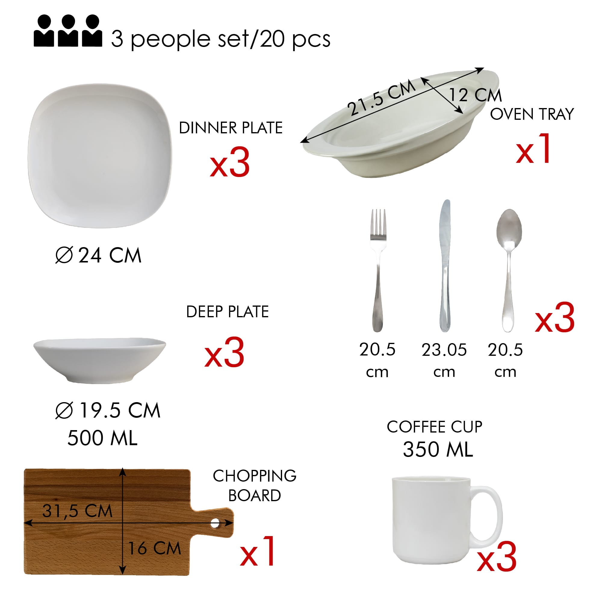 Cutite (3 bucati): Setul include trei cutite de inalta calitate, fiecare cu o lama ascutita si un maner ergonomic pentru o prindere confortabila. Acestea sunt perfecte pentru taierea si felarea usoara a alimentelor in timpul pregatirii mancarurilor.