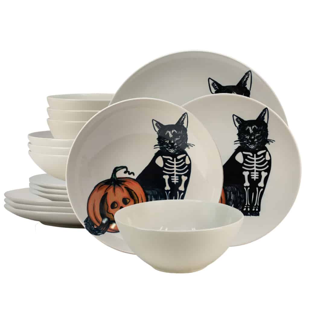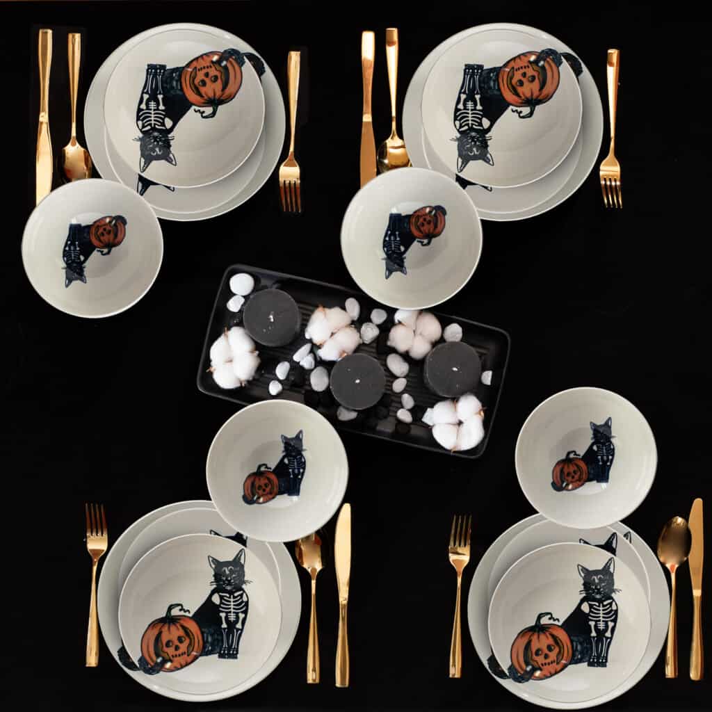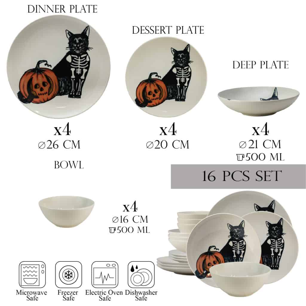 Set farfurii 16 piese, pentru 4 persoane, Skeleton Kitty, Cesiro, Ivoire cu Pisica