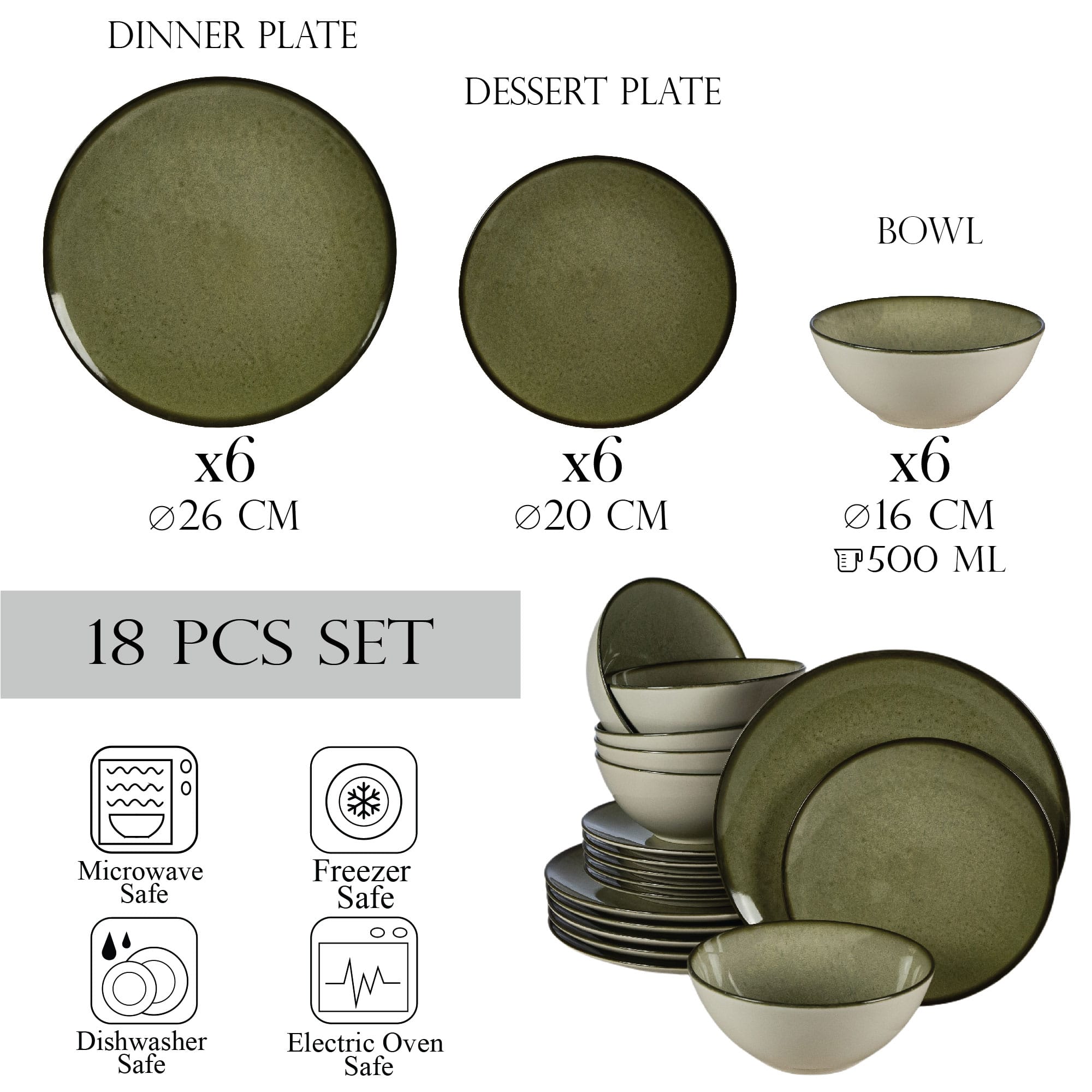 Set farfurii 18 piese, pentru 6 persoane, Earth Green, Cesiro, Alb Ivoire lucios cu verde