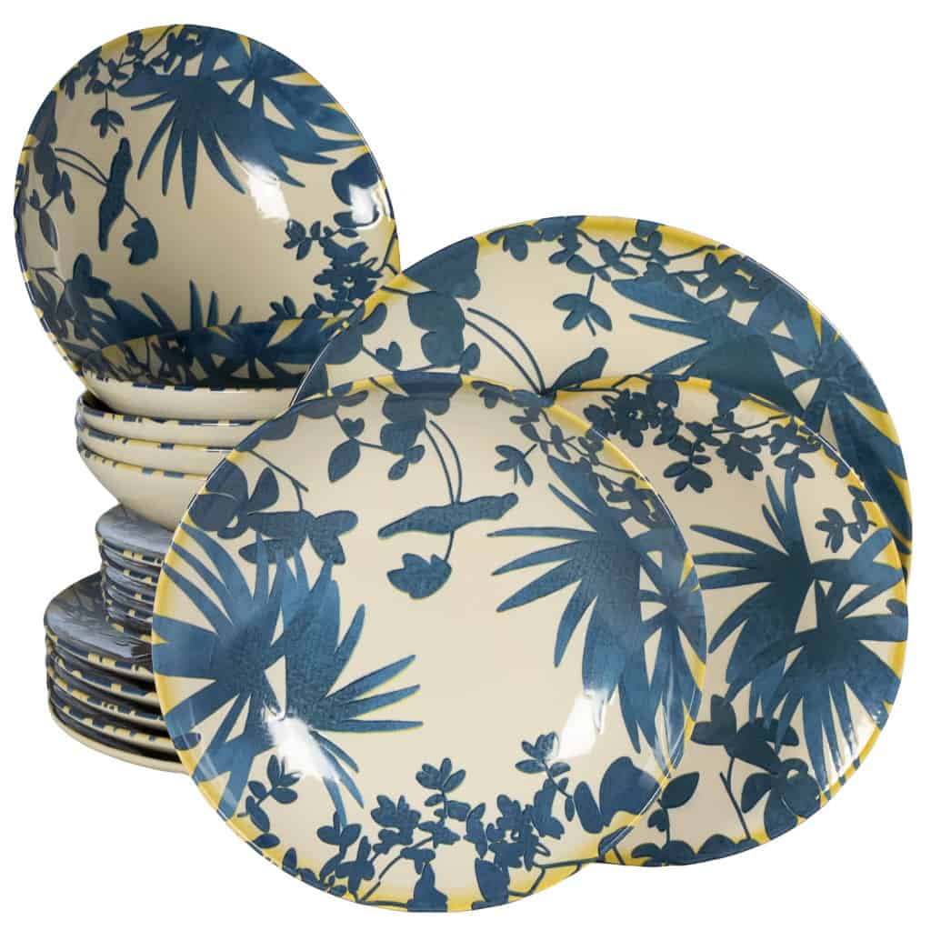 Set farfurii 18 piese, pentru 6 persoane, Hawaii, Cesiro, Alb ivoire cu frunze albastru inchis