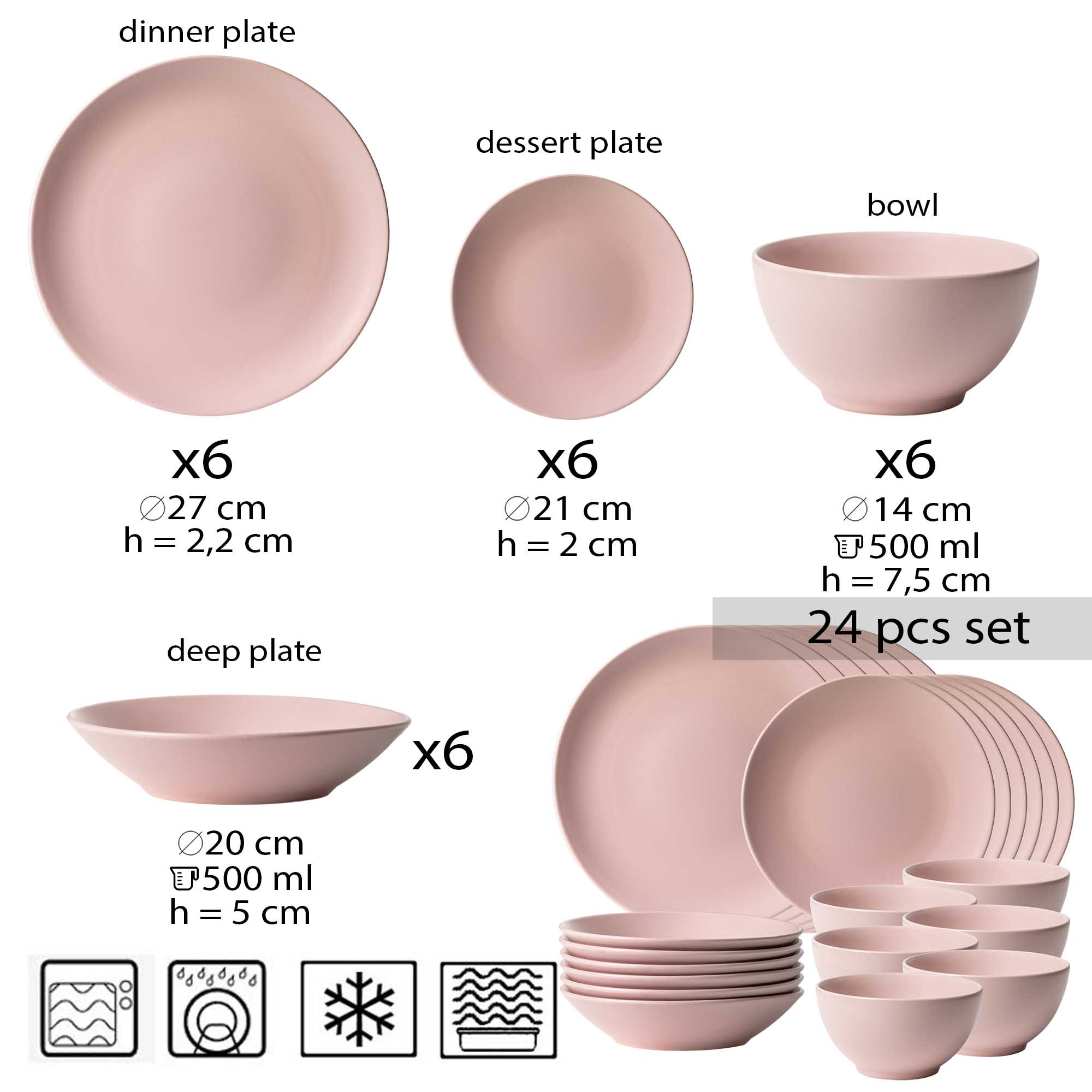 Setul de Veselă Milkshake aduce o combinație perfectă între eleganță și practicitate. Fiecare piesă este finisată cu atenție într-un roz mat rafinat, conferindu-i un aspect modern și sofisticat. Cu un design atemporal, acest set se potrivește perfect pentru diverse evenimente, de la cine elegante la petreceri în familie.