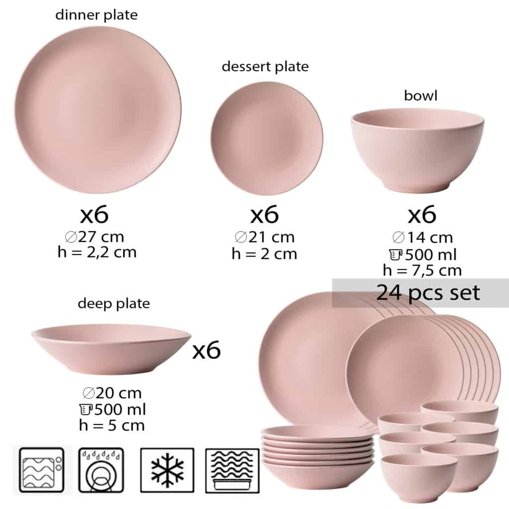 Set farfurii 24 piese, pentru 6 persoane, Pastel Pink, Cesiro, Roz Mat