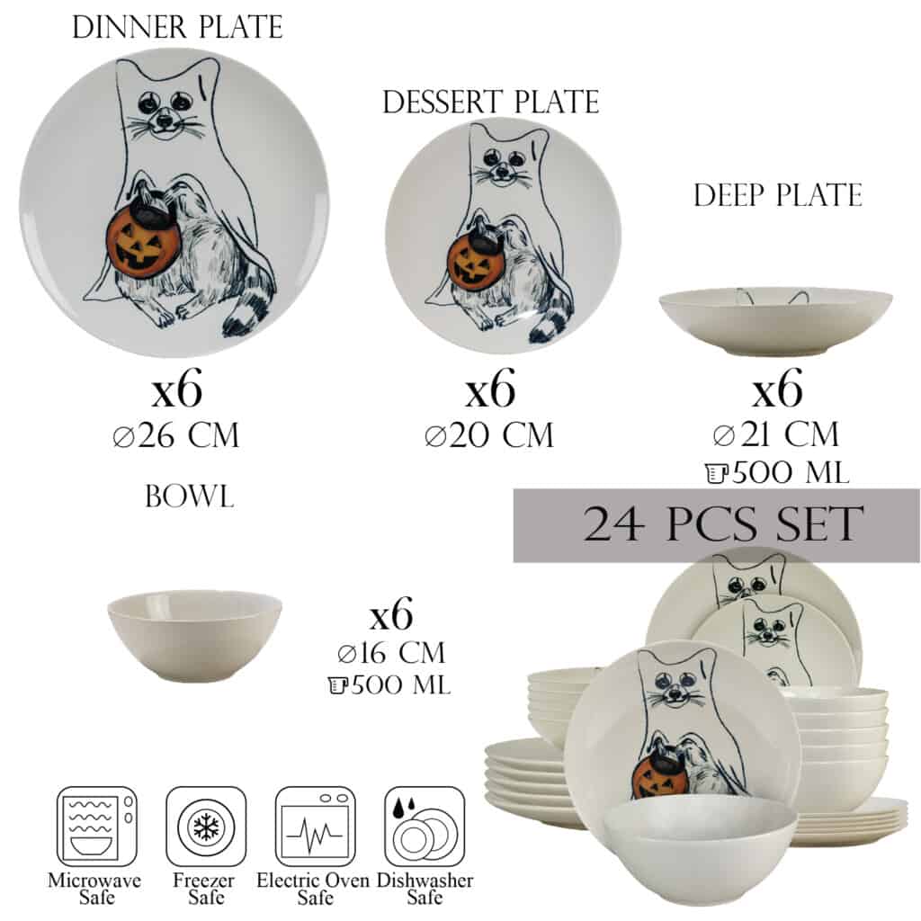 Setul de Veselă Pumpkin Cat conține 24 de piese esențiale pentru a servi 6 persoane, inclusiv farfurii, farfurii de desert, farfurii adânci și cupe. Indiferent dacă savurați o cină romantică sau un prânz în familie, acest set vă va ajuta să creați o masă completă și elegantă. Fiind un cadou ideal pentru cei dragi sau un răsfăț personal, acest set de veselă este perfect pentru orice ocazie specială.