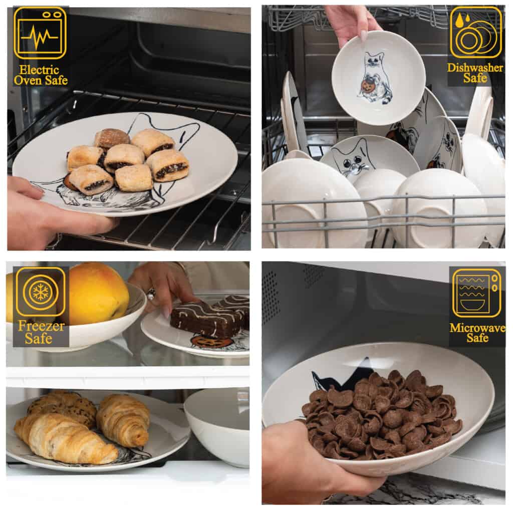 Setul de Veselă Pumpkin Cat este nu doar un element decorativ, ci și practic și funcțional. Toate piesele pot fi spălate în mașina de spălat vase, oferindu-vă comoditate și economisind timp. Acestea sunt compatibile cu cuptorul cu microunde și cuptorul convențional, permițându-vă să le utilizați în diverse situații. Cu un design versatil și ușor de întreținut, Pumpkin Cat vă va însoți în numeroase momente memorabile cu stil și eleganță.