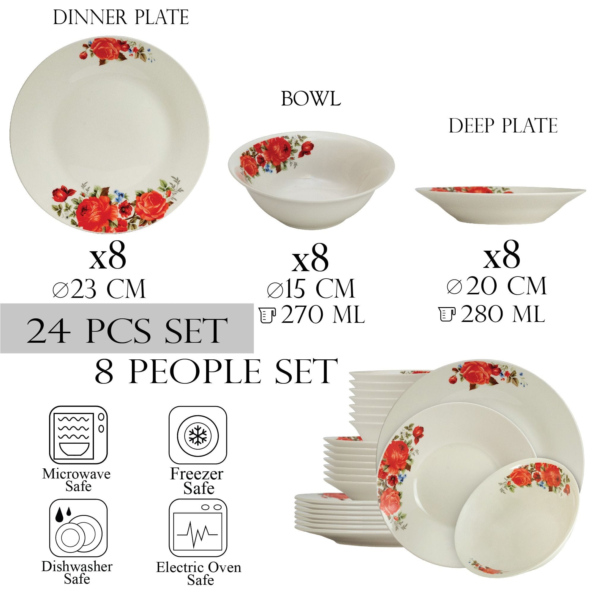 Farfuriile adanci au un diametru de 20 cm si pot contine pana la 280 ml de mancare, facandu-le perfecte pentru supe, tocane si alte feluri de mancare cu mult lichid. Adancimea farfuriilor le face, de asemenea, ideale pentru preparate ca paste si salate. Bolurile sunt ceva mai mici, cu 15 cm in diametru, dar au inca o capacitate generoasa de 270 ml, facandu-le potrivite pentru cereale, supa sau o portie mica de paste sau salata. Farfuriile au un diametru de 23 cm, ceea ce le face perfecte pentru feluri principale si portii mai mari.
