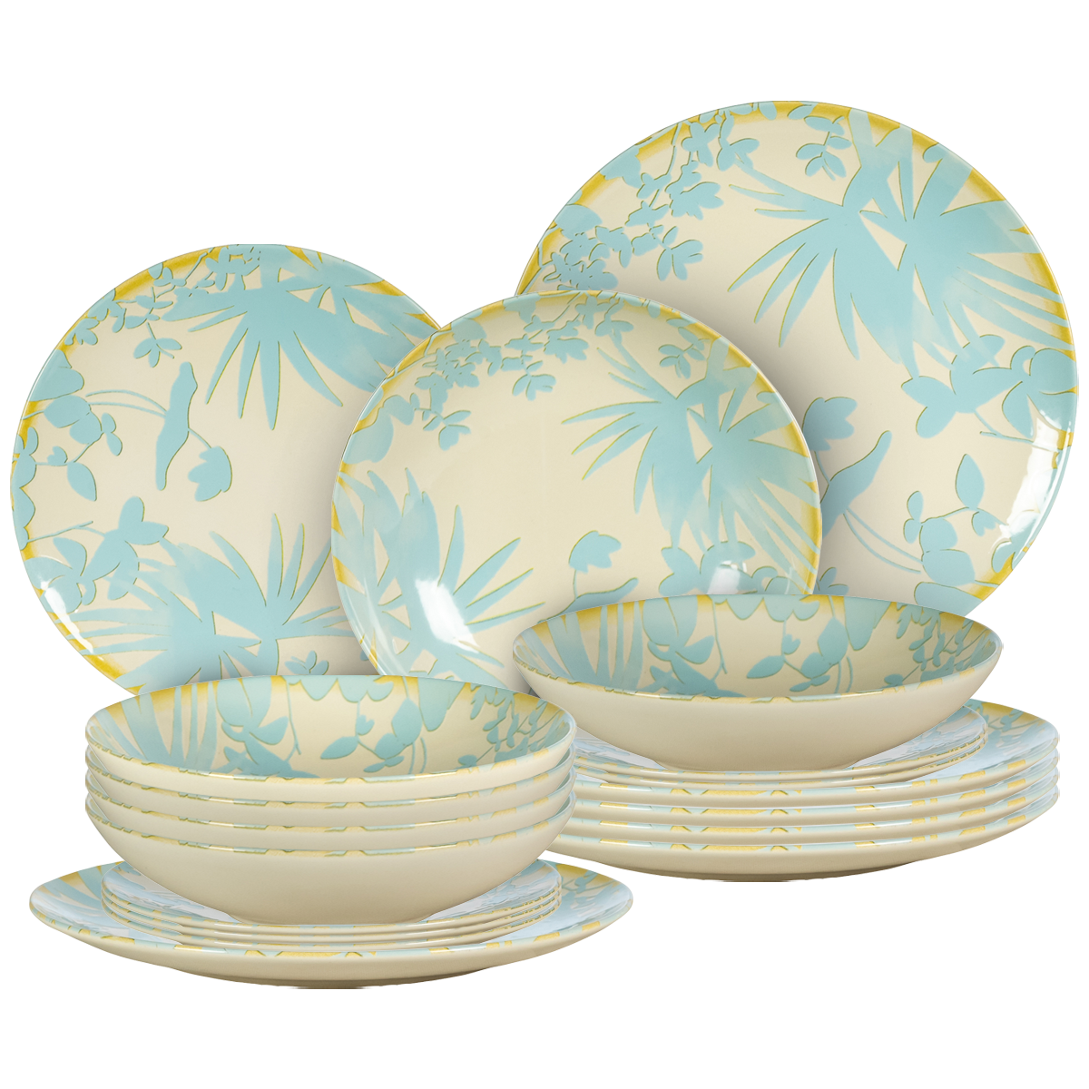 Set farfurii de 18 piese, pentru 6 persoane, Foliage, Ivoire cu frunze Albastru deschis
